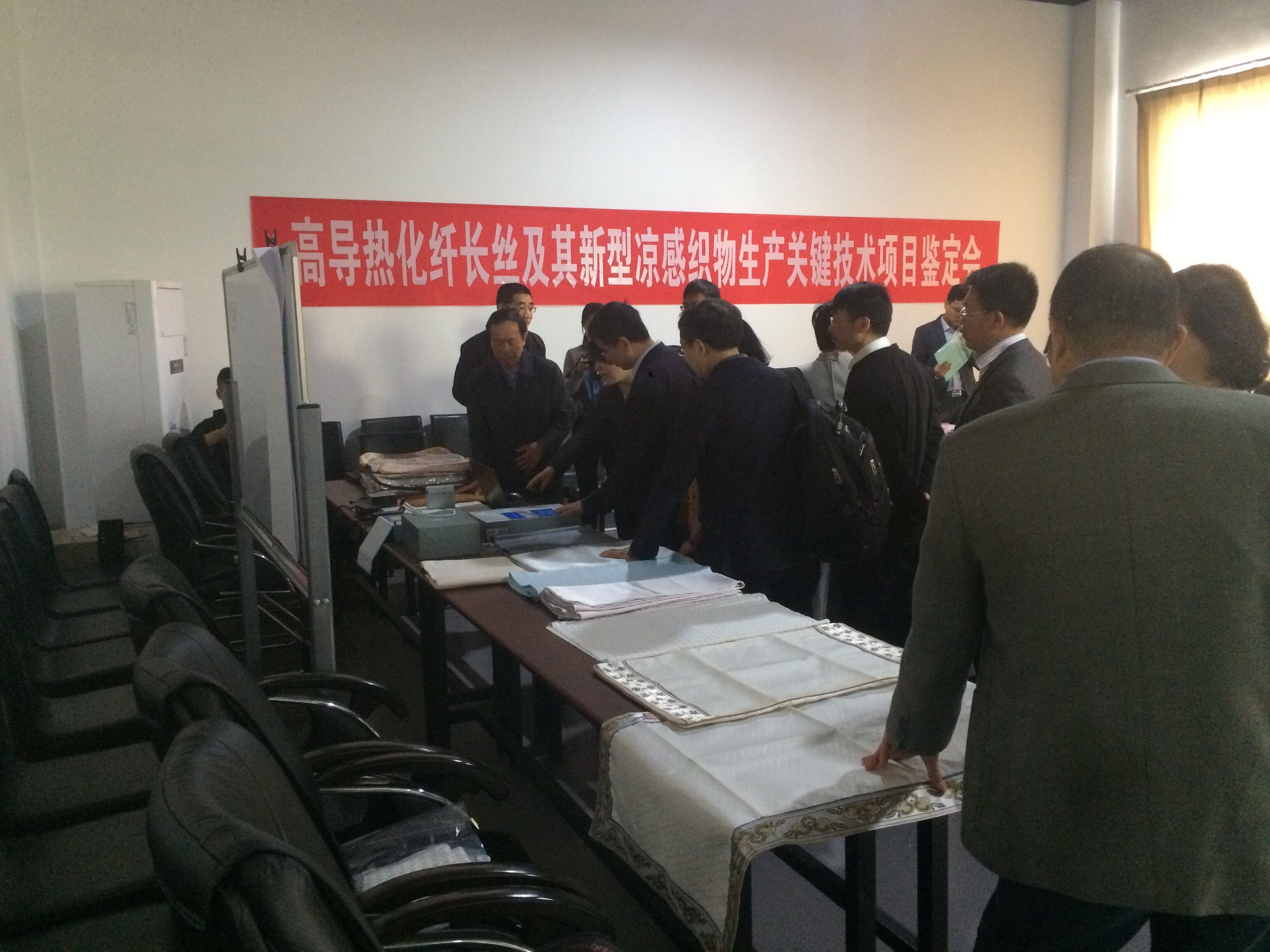 2017年427日,中國(guó)紡織工業(yè)聯(lián)合會(huì)組織召開(kāi)了高導(dǎo)熱化纖長(zhǎng)絲及其新型涼感織物生產(chǎn)關(guān)鍵技術(shù)項(xiàng)目鑒定會(huì)(見(jiàn)圖1、圖2)。其中,由我公司和總后軍需研究所合作研制的用于測(cè)試涼感織物涼爽性能的快速響應(yīng)式FFZ415熱流式織物涼感測(cè)試儀,受到了鑒定委員會(huì)的認(rèn)可,項(xiàng)目順利通過(guò)鑒定。